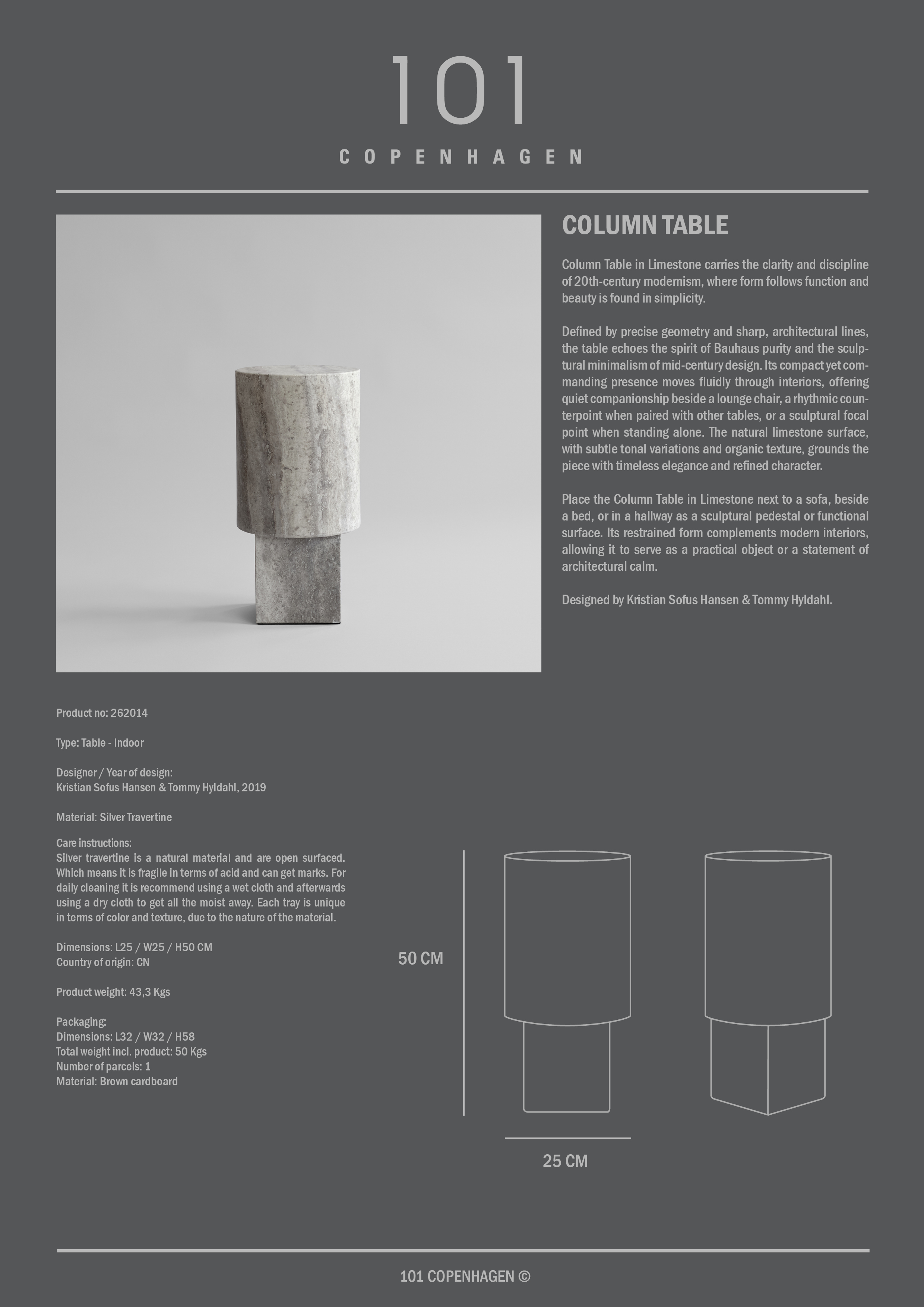 101 Copenhagen Column Side Table Silver Travertine 892 € Live price match Ready for delivery in 30–40 days Add to basketExplore more product information Quick delivery 365-day return policy Authorised distributor