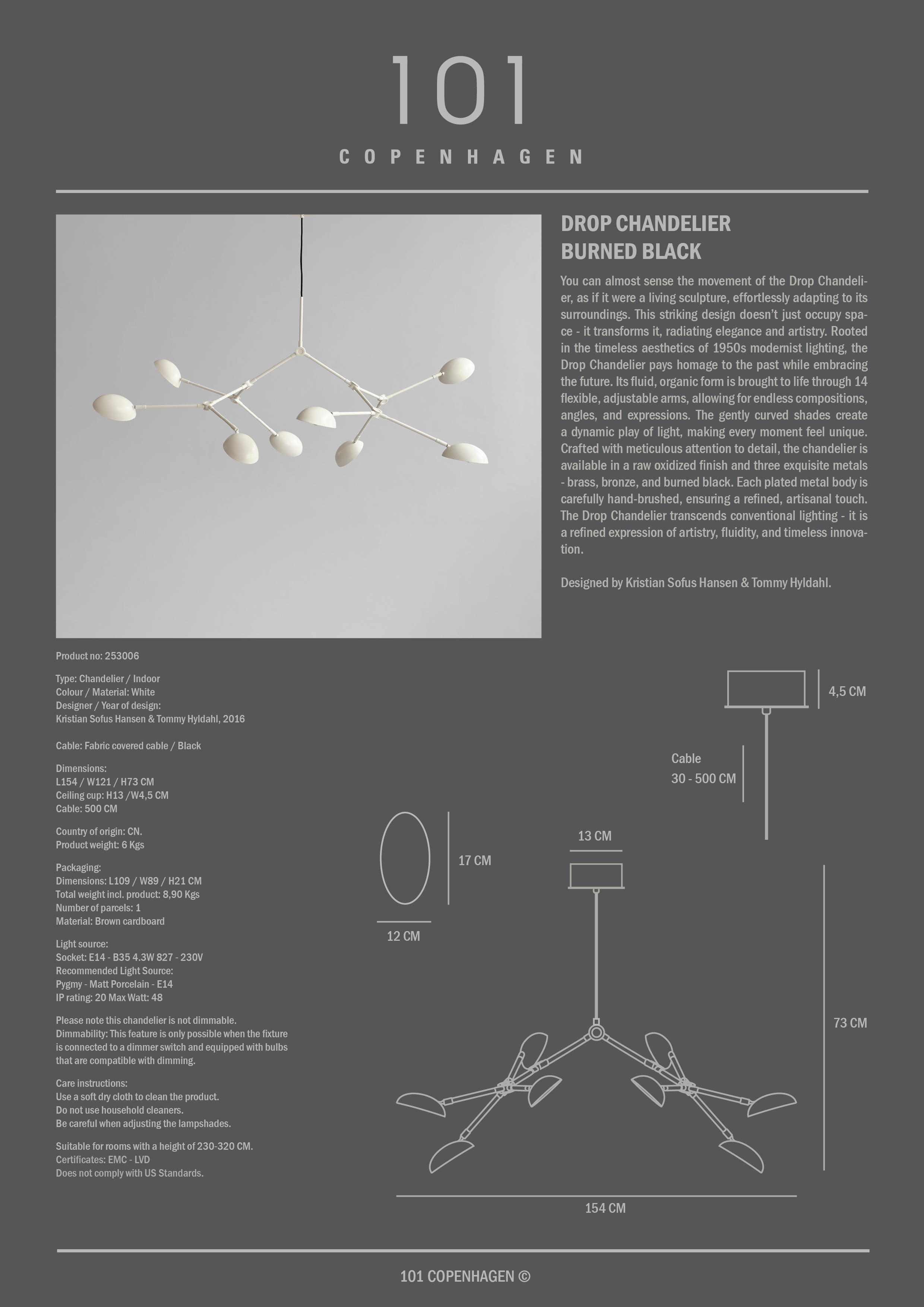 Drop Chandelier is like a living sculpture that adapts to its surroundings and creates an elegant and artistic expression. Inspired by 1950s modernist lighting, it unites past and present in an organic design with 14 flexible arms that can be adjusted in countless directions. The curved shades provide a vibrant light that changes the mood in the room. The lamp is available in a raw oxidized finish as well as in brass, bronze, Burned Black and white, all hand-brushed for a refined expression. Drop Chandelier is more than a lamp, it is timeless innovation and artistic design. Designed by Kristian Sofus Hansen and Tommy Hyldahl.