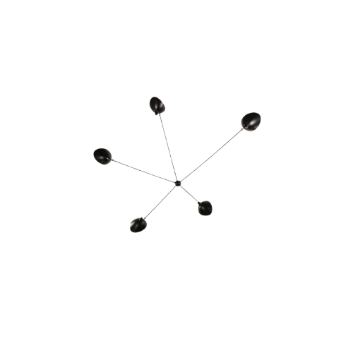 The five-arm Spider wall lamp from 1955 is a striking example of Serge Mouille's sense of dynamic, asymmetrical forms. The five fixed arms of different lengths create a sculptural silhouette, while the aluminum reflectors can be adjusted to shape the light precisely, thanks to the characteristic brass joints. The lamp's steel structure and the contrast between black or white finishes emphasize its timeless elegance and artistic balance.