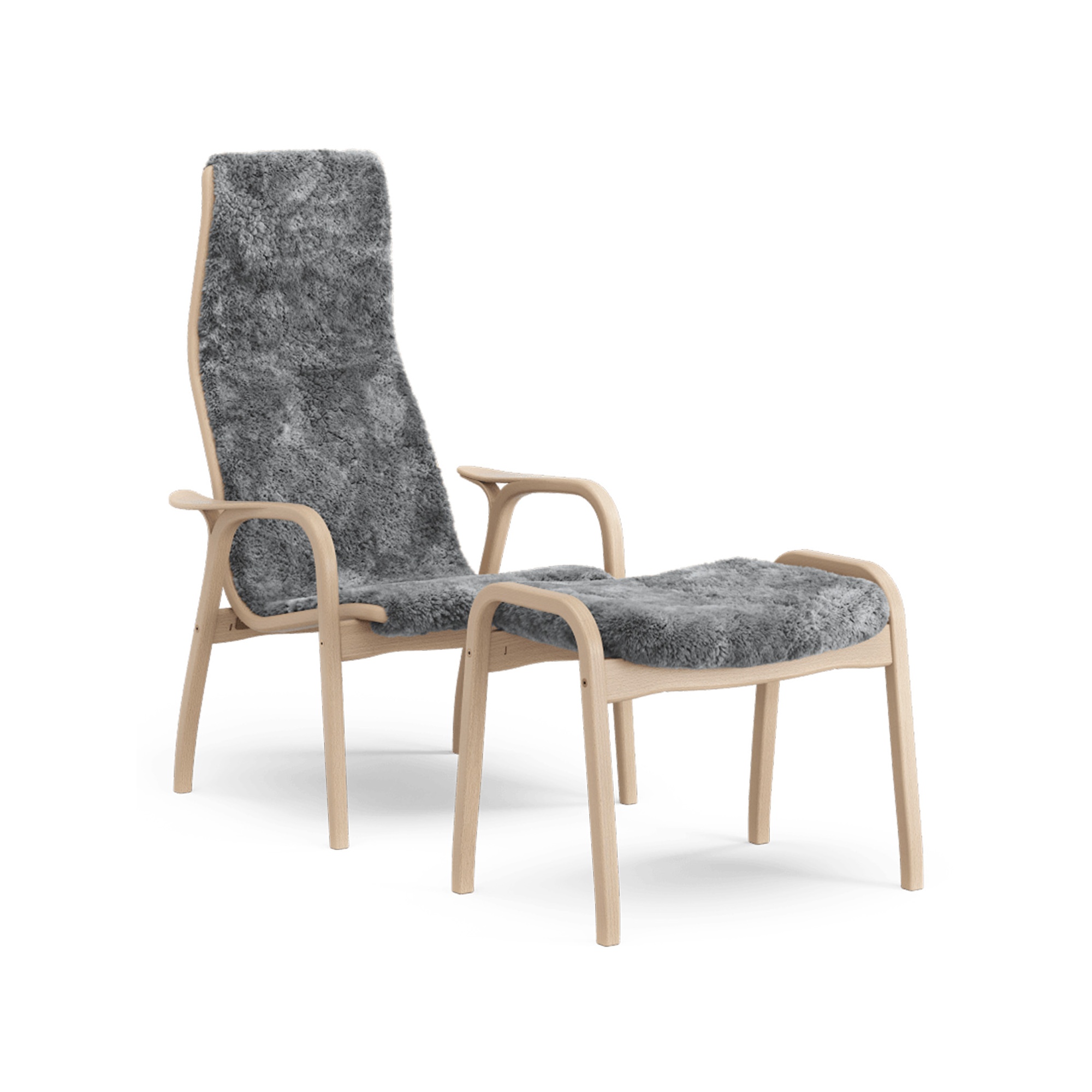 Swedese Lamino Armchair With Footstool High Lacquered Beech Oak/Scandinavian Grey/Sheepskin